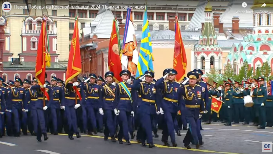 2024年5月9日,前身为“茹科夫斯基空军工程学院”的“茹科夫斯基-加加林空军学院”方阵在莫斯科红场阅兵式上。 (摘自俄罗斯电视台红场阅兵视频)