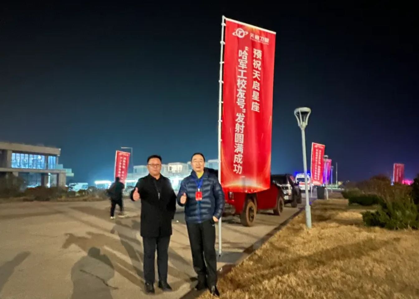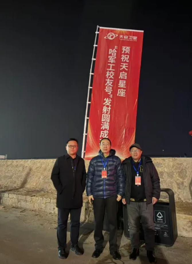 2026年1月16日凌晨,东方日照海域迎来民营航天今年首秀,以海上发射一箭四星之势,将为全球用户提供卫星物联网数据传输服务的天启星座37-40星送入苍穹。其中一星正式冠名为“哈军工校友号”。哈军工北京校友会胡利民副会长、王焱宇副秘书长代表会同“校友会之友企业”——天启卫星建设运营商北京国电高科科技有限公司裴瑶董事等一起赴现场观礼见证。